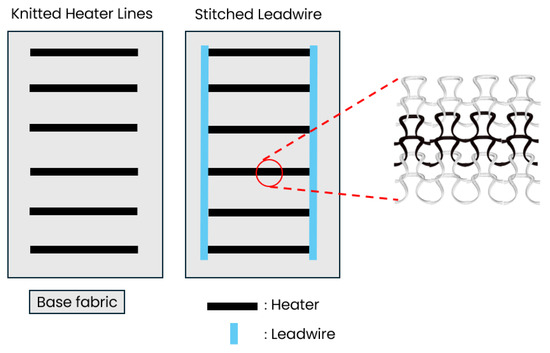 Knitted heaters were fabricated using a combination of knitting and stitching, as illustrated in Figure 2. Initially, double-jersey knit samples were produced with varying numbers of heater lines: 2, 3, 5, 10, and 12. The heater lines were formed using silver-plated nylon yarns integrated into the double-jersey base structure, primarily made from cotton. Double jersey was selected to allow the heating yarns to be situated on a single surface of the fabric and to have the back side as an insulation layer. The heaters were produced with an NP11 setting for the knitting density. The fabric structure had a total width of 100 rows, of which 70 rows were for the heater lines. For the heating elements, Shieldex® 235/36 dtex Z 130 HC + B yarn (Statex Produktions- und Vertriebs GmbH, Bremen, Germany) was selected due to its relatively high resistivity of approximately 768 Ω/m. Lead wires were fabricated using Shieldex® 235/36 dtex 2-ply HC + B yarn, chosen for its lower resistivity of 50 Ω/m. Modern industrial knitting machines like the Stoll ADF series can produce high-resistivity heater lines and the perpendicular low-resistivity lead wires in a single process. The Stoll CMS 530 flatbed weft knitting machine (Karl Mayer Stoll GmbH & Co., Reutlingen, Germany) used in this study, however, can knit conductive yarns only horizontally in the course direction and lacks independent yarn carrier movement in both directions. Therefore, for the samples used to validate the theoretical section, heater lines were knitted first, and vertical lead wires were subsequently added via embroidery.