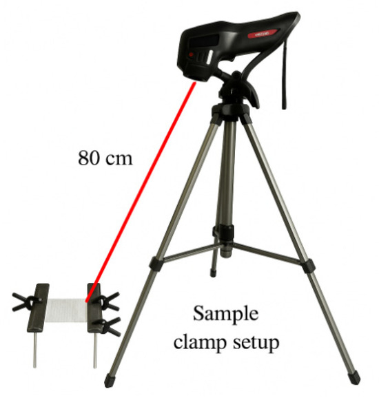 Experimental setup for thermal imaging measurements. A FLIR infrared camera is mounted on a tripod at a fixed distance of 80 cm from the sample, which is secured using a custom clamp to ensure stability during imaging.