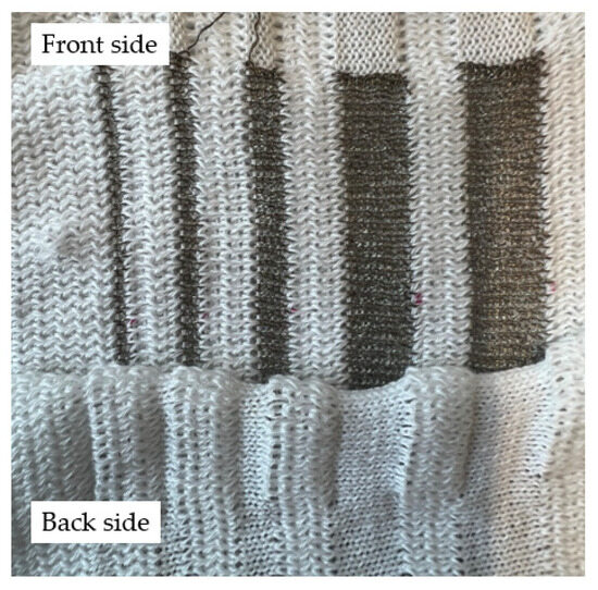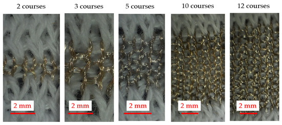 To determine the resistance parameter of Equation (8), samples were knitted with the Shieldex 235/36 dtex-1 ply yarn containing conductive lines with 2, 3, 5, 10, and 12 courses width and 100 wale stitches long. Optical images are shown in Figure 4. As the number of courses increases, the coverage of conductive yarn within the fabric becomes noticeably denser reducing the visible gaps between loops. At two and three courses, the conductive yarn is sparsely visible, with significant gaps between loops. With five courses, the structure becomes more uniform. A close-up image of the different courses is shown in Figure 5. It also demonstrates that the double-jersey structure, with its different front and back sides, helps produce insulated textile heaters. The stitch densities in the course and wale directions were calculated as 4.72 courses/cm and 10 wales/cm, respectively (see Supplementary Materials Figure S2).