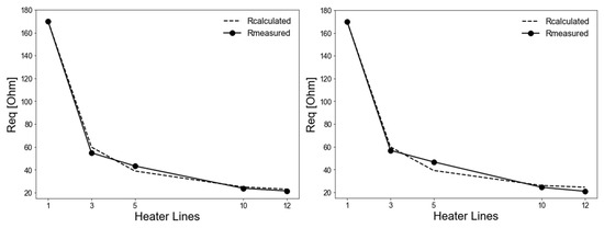 The overall heater resistances predicted by Equations (2) and (3) are compared with the measured values in Figure 6. The comparison reveals that the equivalent resistance decreases as the number of heater lines increases. In both graphs, the measured values closely follow the calculated values, indicating that the theoretical or modeled calculations align well with the experimental measurements. The largest drop in resistance occurs between one and three heater lines, and the curves tend to flatten as the number of lines in-creases, suggesting diminishing changes in Req for higher numbers of heater lines. The similarity of the deviations observed in both configurations indicates that the model captures the physical behavior of the system, while opportunities for refinement remain.