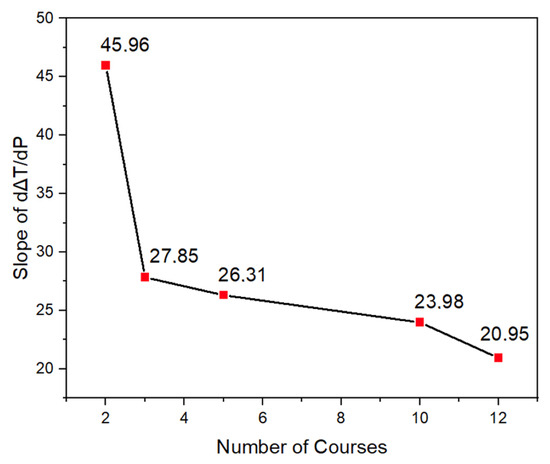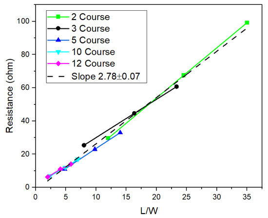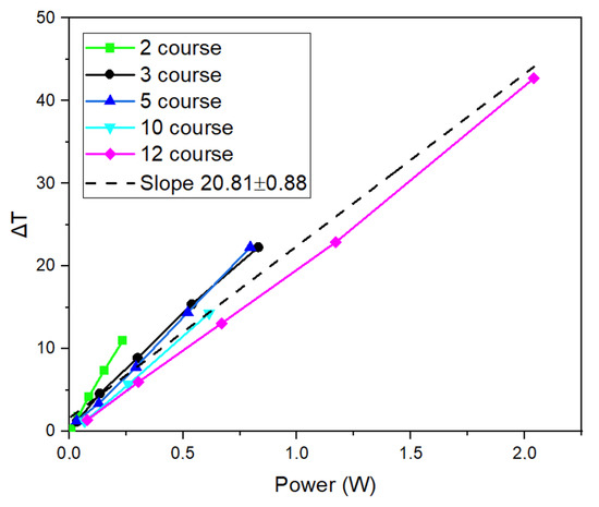 The temperature change (∆T) versus power (P) graph is shown in Figure 8. All curves exhibit a linear trend, indicating that ∆T is proportional to the applied power. The slopes of the lines for the 3, 5, 10, and 12 course lines are, respectively, 20.95, 23.98, 27.70, and 26 °C/Watt. The corresponding mean absolute error (MAE) and root mean square error (RMSE) values are low across all configurations, indicating that the linear model accurately represents the measured data (see Supplementary Materials Figure S1). The results of the two-course sample deviate significantly from this trend. To verify this deviation, two additional measurements were performed, resulting in an average slope for the two lines of 45.96 ± 1.28 °C /Watt (see Supplementary Materials Figure S3). The resistance coefficient Cl for the 0.2 cm wide lead wires was determined to be 0.67 ± 0.03 Ω by plotting the resistance of lead wires versus L/W (see Supplementary Materials Figure S4).