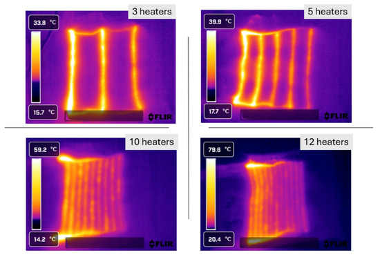 As explained in the introduction, lead wires with non-zero resistance cause progressively lower currents in subsequent heater lines. In the present examples, the lead wire resistance is substantial (0.67 Ω cm−1), leading to significant voltage drops and corresponding reductions in current. As shown in Figure 8, these effects manifest as poor heating performance at locations distant from the power input points. While such pronounced non-uniformities in heating should be avoided in practical applications, they are valuable here for validating the proposed model.