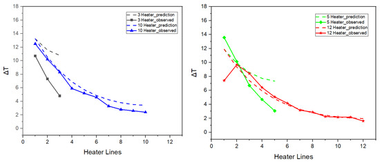 Figure 11 shows the corresponding results for the diagonal configuration. Unlike the ladder configuration, both the predicted and observed values display a non-monotonic trend, with a minimum temperature in the middle. For the three- and five-line heater configurations the observed and predicted values diverge more significantly, ranging approximately from 3.5 to 5 °C and from 3.6 to 5.3 °C, respectively. In contrast, the 10- and 12-heater configurations exhibit a smoother, more consistent temperature profile and better agreement between predicted and observed temperatures (within ~1 to 2 °C).