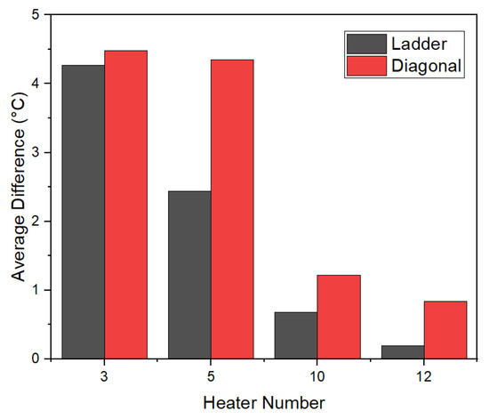 The heatmaps illustrate the impact of heater arrangement and quantity on relative error as shown in Figure 14. Increasing the number of heaters generally lowers the relative error in both ladder and diagonal configurations. In the ladder configuration, the darker red colors for the three- and the five-line heaters indicate overprediction of the temperature, while in the diagonal configuration, the darker blue colors correspond to an underprediction of temperature. In the ladder configuration, relative errors tend to decrease as the number of heaters increases, particularly noticeable for 10 and 12 heaters. These results highlight the importance of heater arrangement and quantity in controlling system precision and suggest that design optimization should consider both factors to minimize relative error.