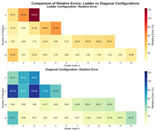 Comparison of relative errors (%) for ladder and diagonal heater configurations with a different number of heater lines. The heater index k corresponds to the heater line numbering defined in Equation (6).