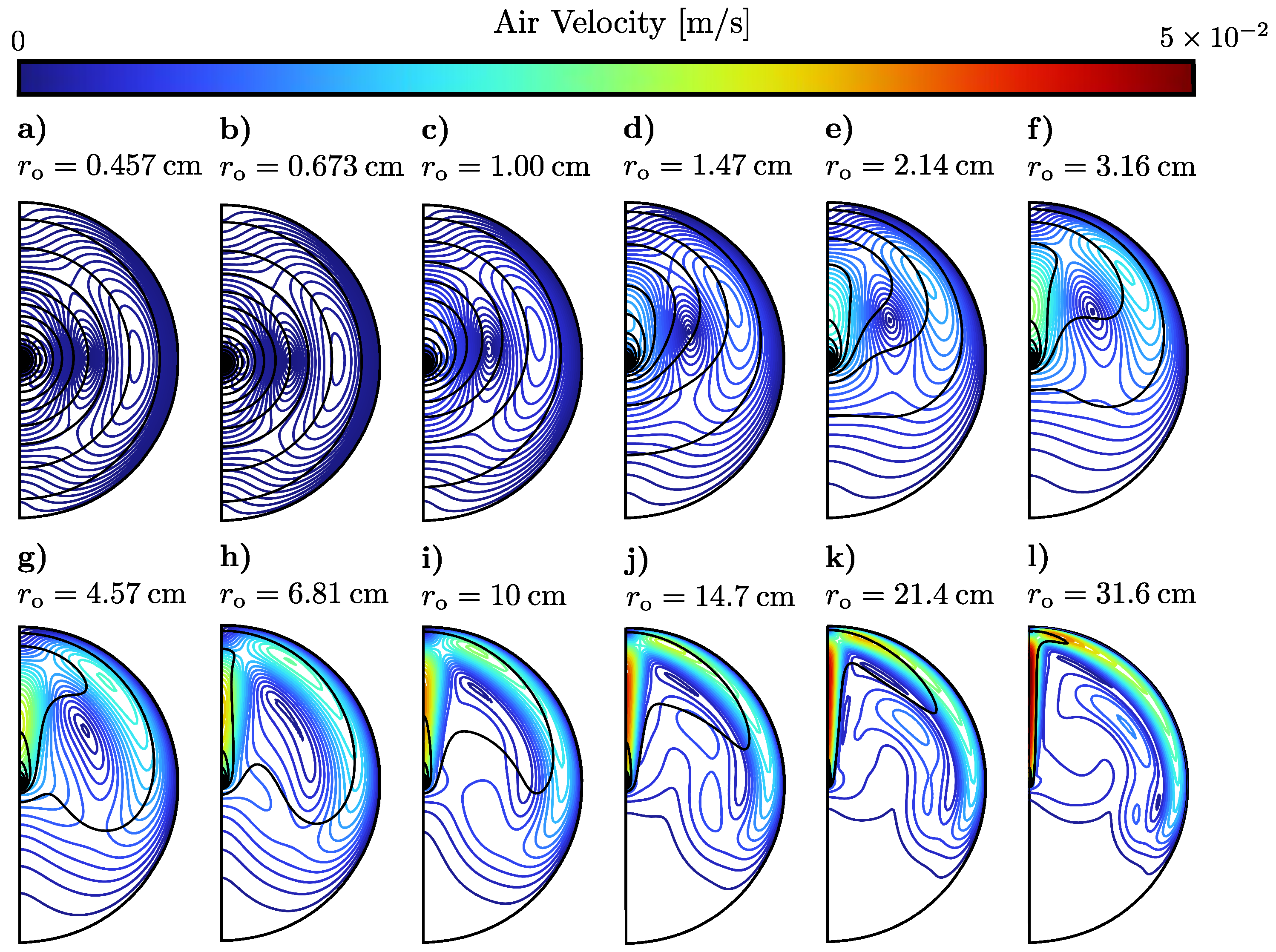Figure 5. Velocity (color scale) and temperature (black) contours of twelve different values of r o , chosen around the point where k eff / k starts to increase. As the size of the system increases, the velocity of the air circulation increases. Δ T = 10 K and r i =   45.7   μ m for all curves.
