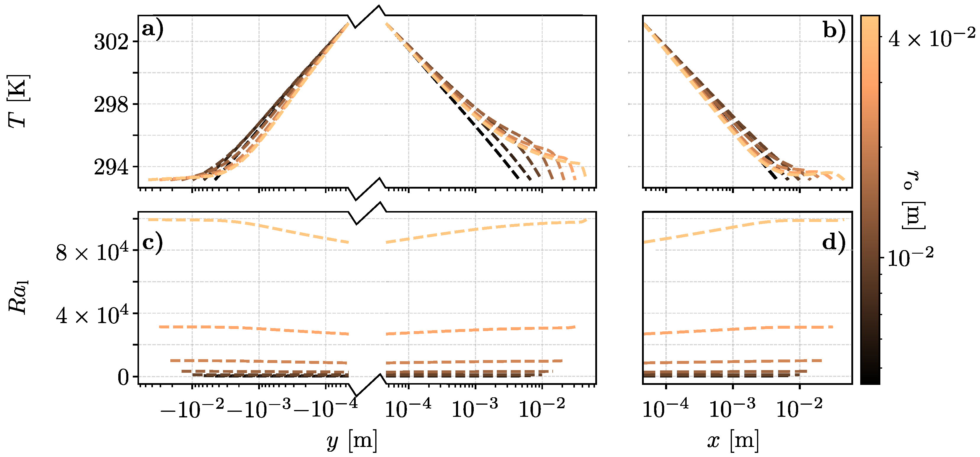 Figure 6. Visualization of temperature and local Rayleigh number profiles with a single, shared colorbar showing the value of r o . Top row (a,b): temperature; bottom row (c,d): local Rayleigh number. (a,c) show profiles along the y-axis using a merged logarithmic axis: for y < 0 the horizontal coordinate is x = ln | y | , and for y > 0 it is x = ln y . (b,d) show profiles sampled along the x-axis.