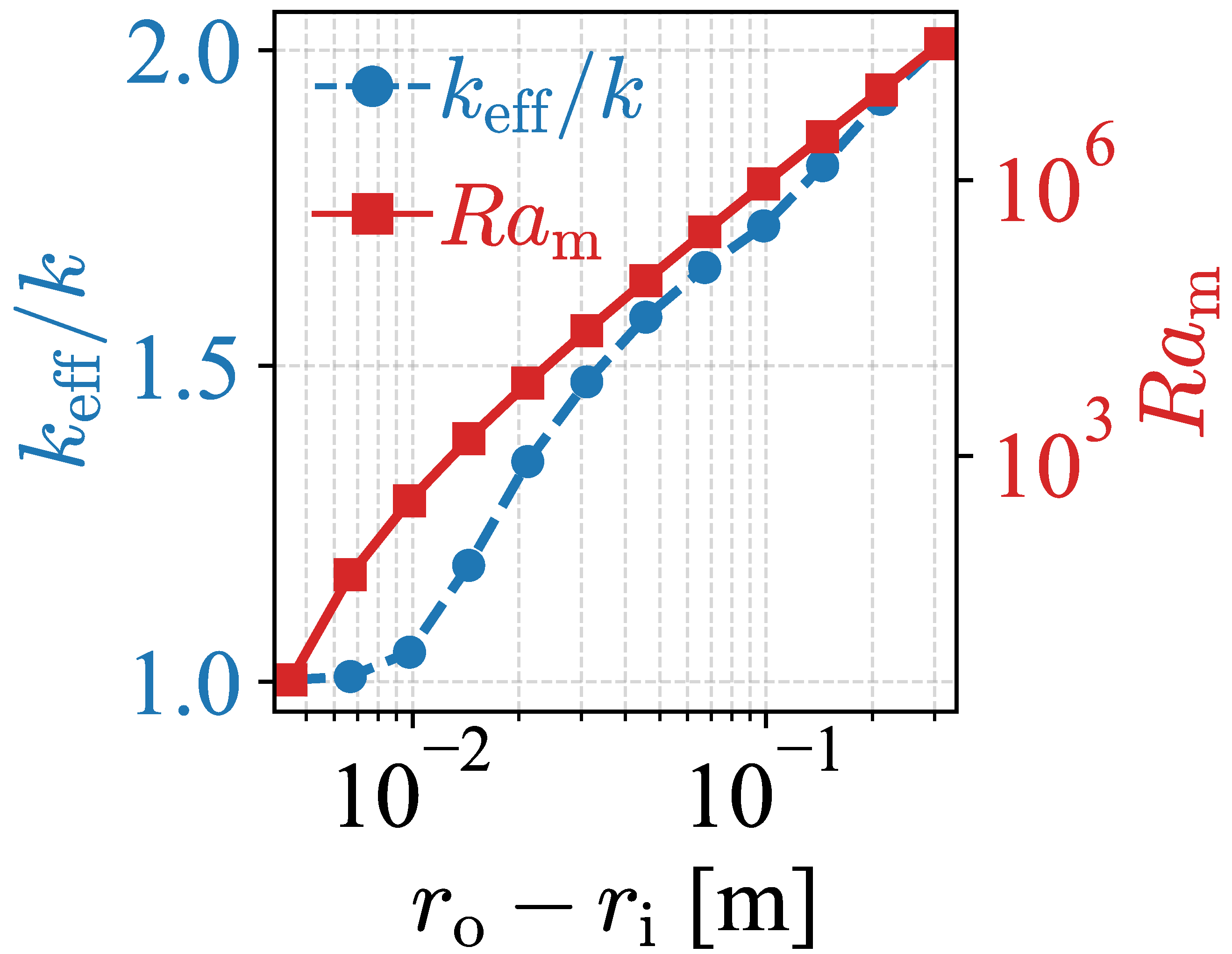The resulting values of R a m as a function of r o r i , for the same parameters in Figure 5, are shown along with k eff / k in Figure 7. For larger values of r o , k eff / k is roughly proportional to log ( R a m ) , before the correlation breaks down at smaller scales. This is similar to the behavior of other concentric cylinder systems, although with a different characteristic length.