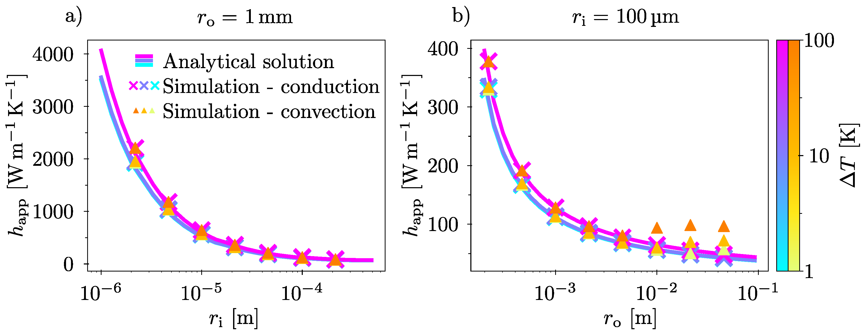 One way to determine the distance r o r i for which the transfer from a concentric cylinder regime to a free-standing wire regime occurs is when h app becomes constant with increasing r o . In Figure 8b, h app is plotted for r i = 100 μ m . It can be seen from the convection simulation results that the apparent heat transfer coefficient for r i = 100 μ m does not reach a stable level before r o 2 cm for Δ T = 100 K, and only stabilizes for even larger r o for lower Δ T . This implies that for this particular parameter combination, the free standing regime only starts when r o 200 r i —a very large deviation from the macro scale. For lower temperature differences, the deviation is even larger.