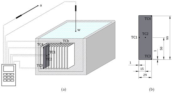 Four K-type thermocouples, with declared accuracies of ±0.2 °C, were placed along the width and length of a representative inner fin surface in order to monitor time-wise temperature changes at various characteristic positions. Thermocouples TC1 and TC2 were placed mid-length along the fin height, 1 and 15 mm from the heat sink base surface, respectively. Thermocouples TC3 and TC4 were placed near the edge of the fin in the height direction, 29 mm from the heat sink base surface, at the bottom and top positions along the length, at 1 and 99 mm from the bottom of the fin. An additional thermocouple was placed at the junction between the vessel and the heat sink base to obtain the heat sink base temperature (TCb). Water bulk temperature inside the vessel (Tw) and ambient air temperature (Ta) were measured using thermistor probes, with declared accuracies of ±0.02 °C. Temperatures were logged every second using a data logger and stored in computer memory. A schematic with thermocouple positions is given in Figure 2, while Figure 3 depicts the assembled experimental setup.
