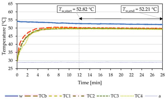 The total experiment ran for 28 min. For the first 12 min, thermocouples at the heat sink positions showed an increase in temperature, but after that, steady-state set in, and it was kept for t = 16 min (960 s). Throughout that time, bulk water temperature had been gradually decreasing. At the start and the end of the steady-state period, bulk water temperature was read, standing at Tw,start = 52.82 and Tw,end = 52.21 °C, respectively. In the same interval, the heat sink base temperature decreased by 0.4 °C, going from 50.2 to 49.8 °C, averaging to 50 °C throughout the interval. Heat sink surface temperatures exhibited even less variation in the same period, up to 0.3 °C. Temperature profiles of water (w) and air (a), as well as the heat sink base (TCb) and surface (TC1, TC2, TC3, TC4) throughout the measurement period and their averaged steady-state readings, are given in Figure 4 and Table 1, respectively.