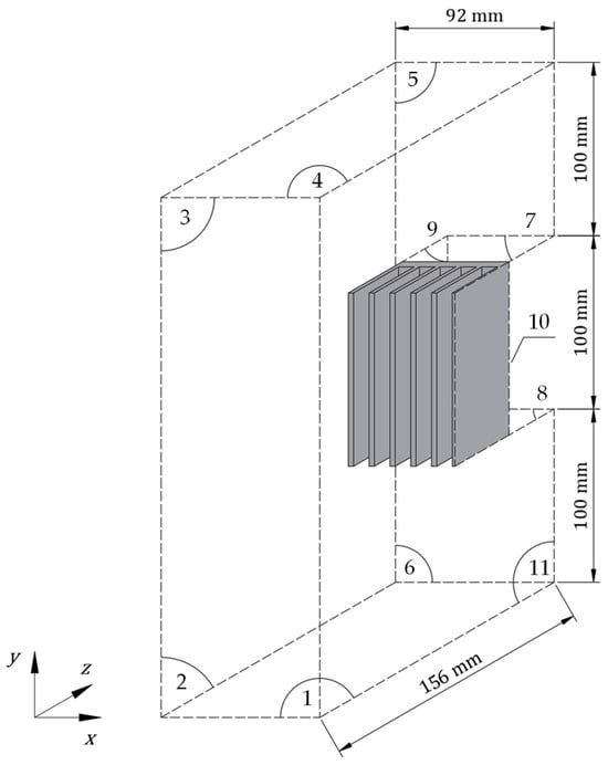 To accurately describe the natural convection phenomena in the vicinity of the heat sink, a surrounding air enclosure was defined. In the y direction, it extends 100 mm below the bottom of the sink and 100 mm above its top. In the x direction, the air region extends 30 mm beyond its side. In front of the heat sink, the air region reaches 90 mm outward from the fin tips, and at the back, it extends 30 mm from the base (both in z direction). The latter does not include the region behind the heat sink base, since that surface is in contact with the electronic component. The computational domain defined in this manner consists of two subdomains—the aluminum heat sink and the surrounding air—and is shown in Figure 5.