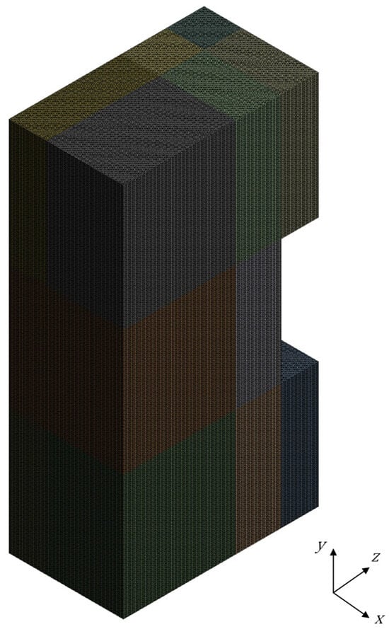 To ensure mesh independence of the numerical results, a grid sensitivity analysis was conducted by comparing the specific heat flux at the heat sink surface for three mesh sizes: 525,900, 4,119,600, and 8,968,725 cells (Figure 6). The results exhibited minimal variation across all mesh configurations, with the smallest relative difference observed between the two finest meshes (with 4,119,600 and 8,968,725 cells), indicating that the solution is mesh-independent. Consequently, the mesh with 4,119,600 cells was selected for all subsequent simulations. The corresponding mesh configuration is shown in Figure 7. Different colors indicate the multi-block decomposition of the air subdomain; the blocks were laid out to match the fin passages and to align the surrounding enclosure with the heat sink geometry, enabling a structured hexagonal mesh.