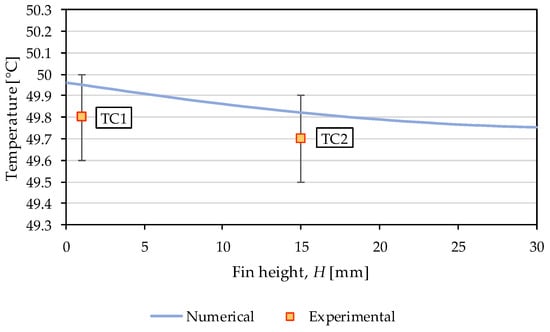 Comparison of numerically obtained temperature profiles along the representative fin height with experimentally measured temperatures at positions TC1 and TC2.