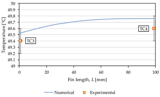 Comparison of numerically obtained temperature profiles along the representative fin length with experimentally measured temperatures at positions TC3 and TC4.