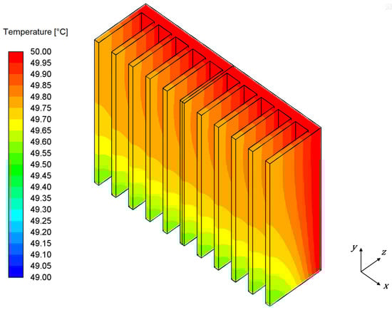 From Figure 12, it can be seen that the base of the heat sink, which is subjected to a constant temperature boundary condition, exhibits the highest temperature. Along the fin height, a gradual temperature decrease is observed, primarily due to heat conduction within the fin material and subsequent dissipation into the surrounding air via natural convection. The resulting temperature profile reflects the non-uniformity of heat transfer along the fin; the lower region remains cooler and is dominated by convective heat loss, driven by the larger temperature difference between the fin surface and the ambient air. As the air rises and becomes progressively warmer, the local temperature gradient decreases, thereby reducing convective heat transfer from the upper fin region. Additionally, the outer fins exhibit slightly lower temperatures compared to the inner ones, likely due to increased exposure to the surrounding cooler ambient air.