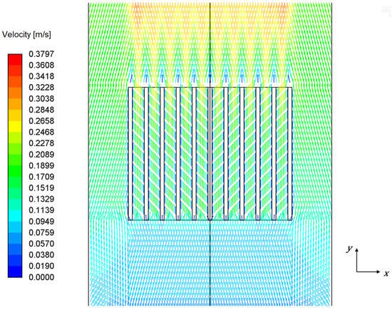 In order to examine the flow field, the distribution of velocity vectors in the fins’ mid-height plane (H = 15 mm) is presented in Figure 13.