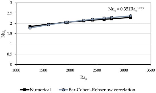 To further generalize the results and compare them with established natural convection models, the data were expressed in terms of the Nusselt number (Nus) and Rayleigh number (Ras). The Rayleigh number was calculated using the average heat sink surface temperature, with properties evaluated at respective film temperatures. Nusselt numbers were obtained in two ways: from the heat transfer coefficients obtained from the numerical results and by using the Bar-Cohen and Rohsenow correlation [11] given in Equation (12). The comparison, along with the best-fit power–-law correlation developed from the numerically obtained Nusselt values, is presented in Figure 17.