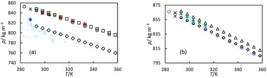 Experimental densities versus temperature: (a) for orange oil (☐) and 79% hydrogenated orange oil (◇) from this work. Literature density data are shown for orange oil from (◆) Tavares Sousa and Nieto de Castro [24], (❌︎) Donoso et al. [15], (▲) Fortunatti–Montoya et al. [23], and for d-limonene from (○) Clara et al. [33], and for 51% hydrogenated orange oil and 47% hydrogenated d-limonene (◆) from Donoso et al. [15]; (b) shows turpentine (△) and 98% hydrogenated turpentine (◇) in this work. Literature density data for turpentine from (▲) Tavares Sousa and Nieto de Castro [24], and (❌︎) Donoso et al. [14], as well as for pinane reported by (○) Wu et al. [35] and for 59% hydrogenated turpentine from (✱) Donoso et al. [14].