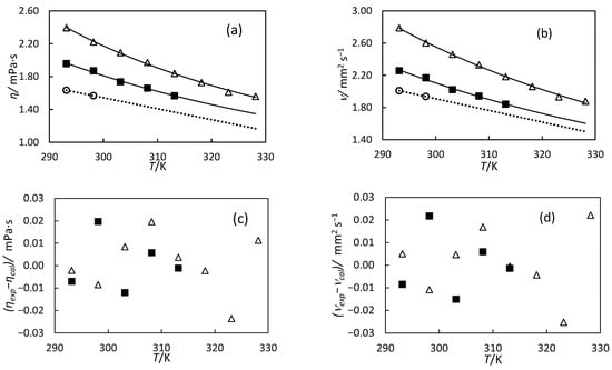 (a) Experimental viscosity, η, versus temperature, T. The line represents the fitting of Equation (7) with the parameters of Table 8. (b) Experimental kinematic viscosity, ν, versus temperature, T. The line represents the fitting of Equation (8) with the parameters of Table 8. (c) Deviations between experimental viscosity and those calculated by Equation (7) versus temperature. (d) Deviations between experimental kinematic viscosity and those calculated by Equation (8) versus temperature. For all graphs, the symbols denote the different oils: 79% hydrogenated orange oil (○), turpentine (■), and 98% hydrogenated turpentine (△). The dotted line is to guide the eye.