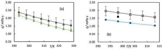 Experimental dynamic viscosity versus temperature (a) for 98% hydrogenated turpentine △ from this work and the literature data for pinane reported by (▲) Wu et al. [35]. (b) shows turpentine (☐) in this work. Literature data for α-pinene (●) reported by Clara et al. [33] and β-pinene (●) by Francesconi et al. [37]. The dotted line is to guide the eye.