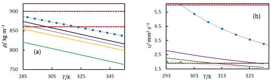 (a) Densities versus temperatures for different biofuels. The solid line represents the fitting density of Equation (5) for essential oils in this work. The blue circle symbol represents the experimental density of soyA biodiesel reported by Pratas et al. [38]. The dashed red lines are the density limit for biodiesel established by EN 14214. (b) Kinematic viscosity versus temperatures for different biofuels. The solid lines represent the fitting kinematic viscosity of Equation (8) for essential oils in this work. The blue circle symbol represents the kinematic viscosity of soyA biodiesel reported by Freitas et al. [39]. The dashed red lines are the kinematic viscosity limits for a biodiesel established by ASTM D6751. For (a,b), the colours of the solid lines represent orange oil (orange), 79% hydrogenated orange oil (green), turpentine (black), and 98% hydrogenated turpentine (purple) in this work. The dotted line is to guide the eye.