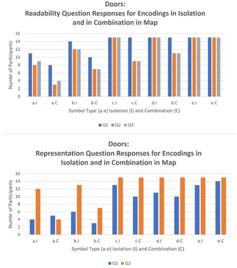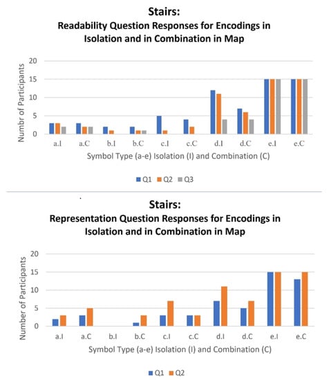 The results of the Readability and Representation questionnaire for the Door and Stair symbol encodings are plotted in the bar graphs below (