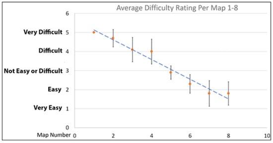 Figure 7, and the error bars represent the standard deviations. The first point has 0 error because all the participants concluded that the map was very hard to read and rated it as 5.