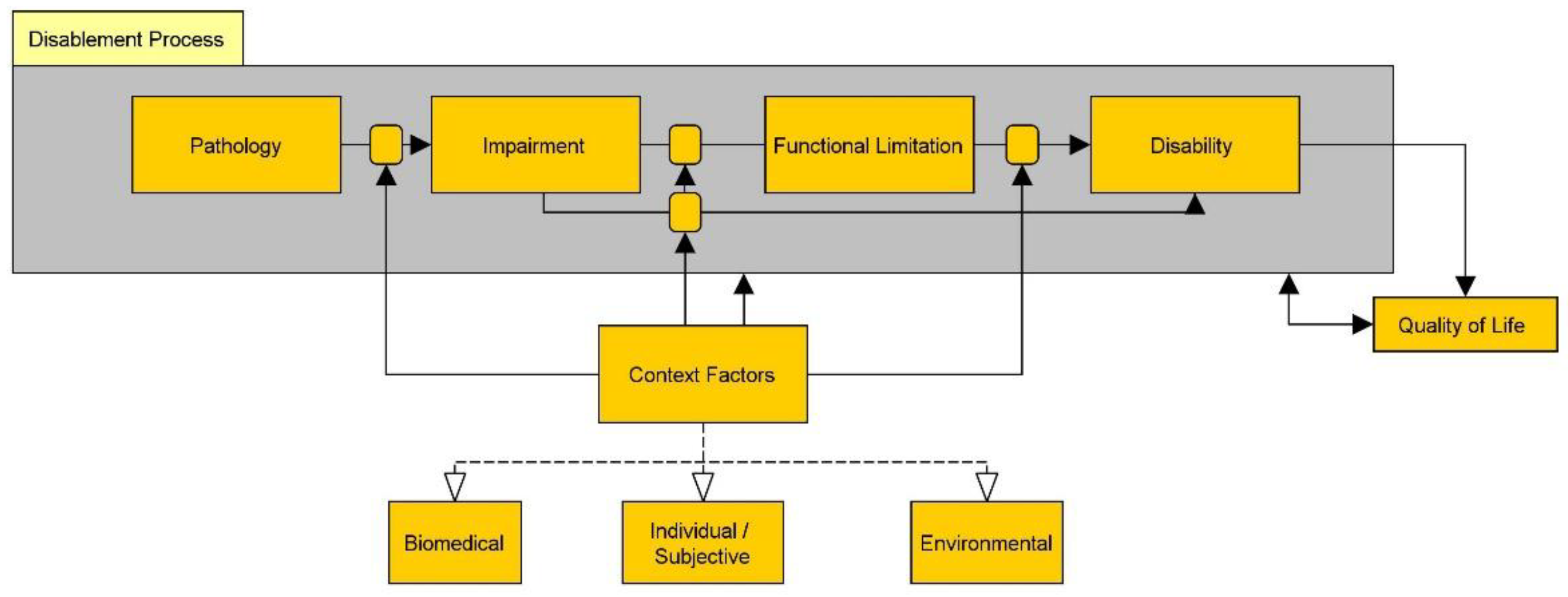 | IOM2 (1997) [52] | pathology (mc), impairment (mc) biological context factors (cf), functional limitation (mc) = body with an impairment, biomedical context factors (cf) | behavioral and lifestyle-related context factors (cf), quality of life (mc) | disability (oc), environment (oc, cf) |