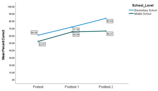 A 2 × 3 mixed analysis of variance was performed on students’ reading performance as a function of assessment and school levels (See Figure 1). The within-subjects independent variable was assessed with 3 levels (pretest, posttest1, posttest2). The between-subjects independent variable was school level with 2 levels (elementary and middle schools). The main effect of assessment was statistically significant (F (2,56) = 14.46, p < 0.001, η2 = 0.34) indicating that students’ scores increased across assessments. The main effect of school level was not significant (F (1,28) = 2.22, p = 0.148, η2 = 0.073) indicating no difference among elementary and middle school students. The interaction effect between assessments and school levels was not statistically significant (F (2,56) = 1.30, p = 0.281, η2 = 0.044). This indicates that school level (elementary or middle school) did not impact assessment scores of posttest 1 or 2, as both groups made significant progress on the posttest.