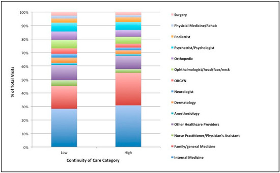 Figure 1 depicts the distribution of healthcare visits to different specialty types across those with high and low care continuity. Individuals aging with CP/SB, irrespective of COC score, saw more than 14 different provider specialties including orthopedic, neurology, and psychiatry specialties. The most common specialties seen for both groups were family/general medicine (FM/GM) and internal medicine (IM) physicians. However, amongst those with high COC, a greater proportion of total visits were concentrated in these primary care providers. For example, 55% of total visits in those with high COC were to IM and FM/GM specialties compared to 45% for their counterparts with low COC (Figure 1). Compared to those with high COC, a greater share of the health care visits of individuals with low COC were spread between a variety of different types of specialties, including obstetrics/gynecologists (OBGYN) (4% vs. 2.8%), orthopedics (6.2% vs. 5%) and dermatologists (3.9% vs. 2.8%).