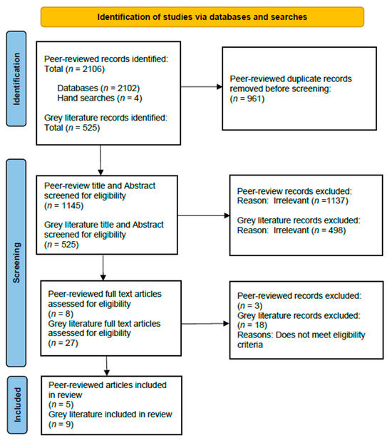 After removing duplicates, the empirical studies and grey literature retrieved from the databases and websites were imported into Covidence software for screening. Following the screening methods outlined in the Cochrane Rapid Reviews Guide (2020), two reviewers (F.N. and P.S.) conducted dual screening of 20% of peer-reviewed abstracts, with conflicts resolved by a third reviewer (K.J.C.). F.N. then screened the remaining 80% abstracts, and P.S. screened all excluded abstracts, with conflicts resolved by K.J.C. Then, F.N. and P.S. conducted further screening of full-text records. Three authors (P.S., M.V., and T.C.) screened the grey literature. All reviewers agreed on the final inclusion of empirical studies and grey literature. The reference lists of the studies included in the full-text screen were also searched for additional sources.