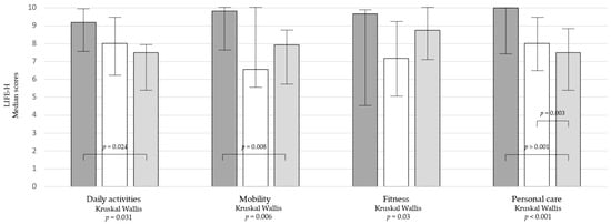 According to age, the subscores of the LIFE-H showed that there were statistically significant differences in transportation between the groups “30–60 years old” and “>61 years old”, with mean scores of 8.52 (1.35) and 6.46 (0.87), respectively (p = 0.027), and between the groups “18–30 years old” and “30–60 years old”, with mean scores of 9.14 (1.02) and 8.52 (1.35), respectively (p = 0.05). The sub-scores of the LIFE-H presented that there were statistically significant differences in this condition between the three groups; the post hoc analysis presented no differences between specific groups.