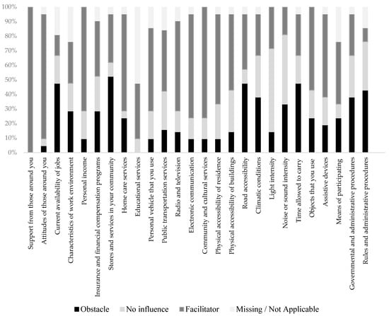 Environmental facilitators and obstacles of participants’ social participation. Presentation of environmental factors facilitating or inhibiting participants’ participation in life habits and social roles. The percentage is the proportion of participants with the corresponding score.