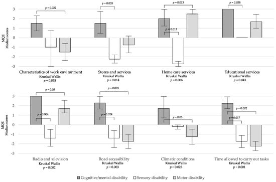 The eight factors of the MQE were identified differently according to the group of disability. The scores of the MQE revealed differences in the perceived quality of the environment depending on the disability group related to ‘characteristics of work environment’ (p = 0.035), ‘stores and services’ (p = 0.014), ‘home care services’ (p = 0.006), ‘educational services’ (p = 0.043), ‘access to radio and television’ (p = 0.002), ‘road accessibility’ (p = 0.003), ‘climatic conditions’ (p = 0.025) and ‘time allowed to carry out tasks’ (p = 0.001). The differences in the perceived environment according to the disability group and post hoc analysis are presented in Figure 3.