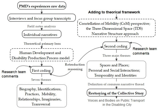 We summarised all interview and focus group transcripts and generated an individual narrative for each interview (identifying recurring themes, i.e., emerging from the data), which were then reviewed by a second member of the research team and transferred to NVivo for coding and qualitative data analysis. Another member of the research team, D.A.R. (cf., Acknowledgments), verified and commented on this first coding. Following a tendency towards complexity, we created an extensive list of codes that could account for the richness of the participants’ narratives, organised into seven themes: biography, identifications, practices, mobility, relationships, imaginaries, and transversal. The codebook was guided by the research questions. It was anchored primarily in the Human Development and Disability Production Process Model [58], bringing out resonances across participants’ narratives about personal and environmental factors influencing their social participation. Using retroduction reasoning [87] the codes reflected our research interest in the themes of mobility and disability, as well as the recurring themes we identified during the interview phase with participants.
