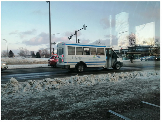 Participants have had different experiences with public transport, often with opposing views on which transport option would be the most appropriate (fixed-route public or paratransit); in practice, their mobility strategies combine, to a greater or lesser extent, both transport networks. They are faced with multiple dilemmas. Some of them perceive paratransit as a service that is neither spontaneous nor flexible and is even “infantilising”: subject to availability, within which they must fit (timetables, routes, reservation rules, luggage restrictions)—recent research describes similar perceptions of paratransit users in Switzerland [36]. In using paratransit, some participants have concerns about their privacy, decision making on their behalf, and the undermining of their sense of self and competence. However, participants unanimously recognise that paratransit is an indispensable element for the emancipation and autonomy of people with disabilities—which is in line with numerous studies on the issue of inclusion and social participation of PMDs [5,16,17]. For others, the fixed-route public bus is a reliable service, which could give them more freedom and privacy in their mobility practices. All participants point out the excellent door-to-door service provided by paratransit, with drivers ensuring the safety of passengers: an added value for PMDs, especially in winter and on rainy days. Figure 2 presents a paratransit minibus of the STAC company—the RTC subsidiary responsible for providing year-round paratransit service in Quebec City.