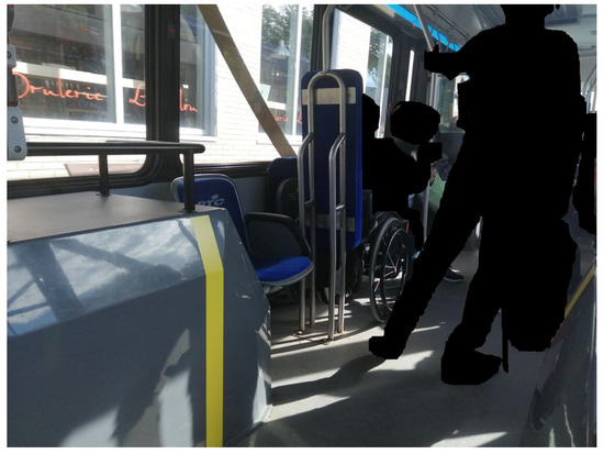 Compared to paratransit, fixed-route public bus travel is uncertain, as there may be unpredictable physical barriers on the two additional journeys needed to complete the itinerary: between point A and the initial stop, and between the final stop and point B (excluding any intermediate transfers)—the last-mile problems experienced by PMDs to reach the bus station [29]. They face a dilemma. Some participants associate the fixed-route public bus with freedom (as it has predictable travel times and frequencies). However, the travel experience in fixed-route public buses can also cause them anxiety: will the disembarkation stop be accessible? Will the transfer between routes work and will I be able to board and alight again? Will the driver attend to my stop call correctly or will it be missed? The unpredictability of travel and not knowing whether streets and bus stops are actually accessible (despite being classified as accessible on RTC applications) can cause anxiety [16,17,35,102]. Figure 3 presents a wheelchair user travelling inside the fixed-route public bus, in the priority zone; at rush hour, manoeuvring a wheelchair can be a negative experience that many PMDs avoid.