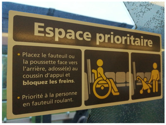 Environmental barriers within fixed-route public buses contribute to limited accessibility for wheelchair users [103]. The lack of priority seats (one or a maximum of two by bus) and inaccessible payment methods (hold out your hand to show a paper or telephone ticket) create social and landscape barriers for participants. These bus design barriers of fixed-route public buses become social barriers. For example, conflicts can arise between wheelchair users and pushchairs for limited priority seats—buggy wars, in which wheelchair users and people with children in pushchairs compete for priority space on the bus [35]. Figure 4 presents the current priority seating signage on fixed-route RTC buses; it specifies that priority is given to wheelchair users.