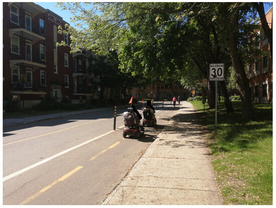 PMDs may depend on others for certain aspects of their mobility. For example, some people need a companion to help them manoeuvre inside buses or to make sure they do not lose their balance. They face a dilemma. They hesitate to ask for help from friends and family so as not to frequently disrupt the life habits of those who choose to accompany them. However, friends and family are often willing and able to support them in their daily mobility activities, and these relationships enable some participants to avoid social exclusion and maintain their social ties—as people with disabilities experience more problems using public transportation for community participation [18]. Faced with this dilemma, participants’ strategies are diverse. Some only use private cars all year round. And few others avoid using paratransit, using instead walkers or wheelchairs on the streets. Figure 6 presents a shared lane that various types of active mobility, including people using electric wheelchairs, use to move around.