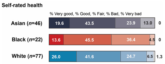 | Physical Health Conditions | Asian (n = 46) % (n) | Black (n = 22) % (n) | Fisher’s Exact | MEC (n = 77) % (n) | White (n = 77) % (n) | Χ2 (1, N = 154) |