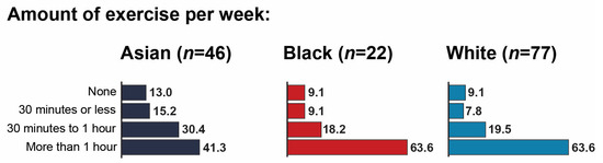 | Physical Exercise | Asian (n = 46) % (n) | Black (n = 22) % (n) | MEC (n = 77) % (n) | White (n = 77) % (n) |