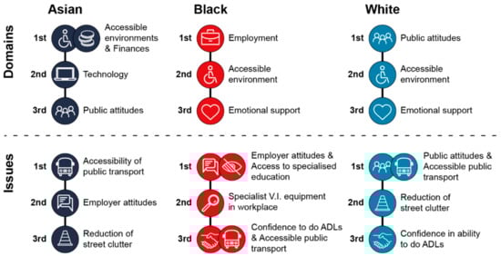 In contrast, Black participants prioritised ‘employment’ and ‘emotional support’ to come to terms with their V.I. alongside ‘accessible environments’. Employer attitudes and availability of specialist V.I. equipment in the workplace were priority issues for Black participants, as was specialised education and support for children with V.I. The importance of these issues may reflect lower employment rates among adults with V.I. [4], and the barriers to employment posed by negative employer attitudes and the lack of adjustments made in the workplace [3,6]. However, as indicated earlier, the role of ethnicity in employment status is unclear [12,16]. In the current sample, there were no statistically significant group differences in employment status. As such, the perceived importance of employment-related issues did not reflect differences in status. Instead, it may reflect dissatisfaction with the roles, career prospects, and/or workplace support available to Black participants.