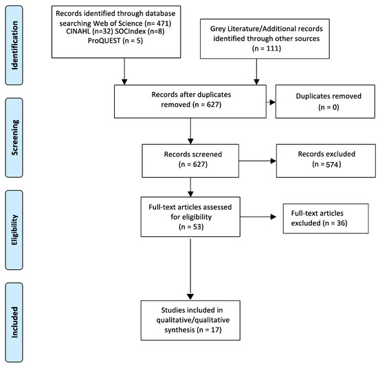 After the removal of duplicates, 627 references were identified from the searches of the electronic databases and grey literature and through manual review reference lists of review articles and reports. Based on the title and abstract screening process, a further 574 articles/reports were excluded. Of the remaining 53 full-text articles/reports, 36 were excluded after review. In the end, a total of 17 publications met the inclusion criteria following a full-text review of the available literature. The screening process for research papers was conducted systematically by the authors. A PRISMA flow diagram has been used to depict the screening process [21] (Figure 1).