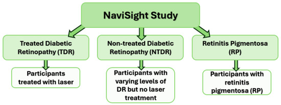 NaviSight Study arms. (TDR = treated diabetic retinopathy, NTDR = non-treated diabetic retinopathy, RP = retinitis pigmentosa).