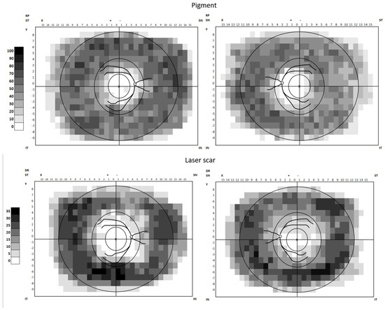 People with diabetes mellitus (DM) and retinitis pigmentosa (RP) were recruited into the study (Figure 1). The rationale for including people with RP as a comparator group was that their peripheral vision loss is well characterised and correlated to barriers in the built environment [25,26,27]. The pattern of their peripheral visual loss/pathology is similar to laser treated DR (TDR). Figure 2 shows the heatmaps of pathology graded on Optos retinal images from people with TDR and RP to show the similarity of peripheral pathology. It was therefore postulated that there may be similar issues in people with RP and TDR in navigating the built environment.