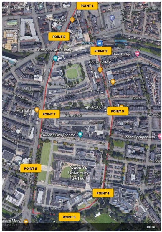 To assess any issues, problems, or barriers faced by participants in the built environment, participants walked a pre-planned route around an area of Belfast (Figure 3). This route was chosen due to its access to public transport, proximity to the City Hospital (where the research facility is located), and the presence of many types of streetscapes. We used a walking interview method, which allowed better understanding of participants’ lived experiences and perceptions [30] and empowered participants [31,32,33]. Participants were accompanied by two researchers and were encouraged to talk about any issues or barriers they encountered. No specific prompts or questions were asked for free flow of conversation, and notes on the discussion were taken. Participants were also asked to assess the level of difficulty, confidence, and anxiety they felt at each point (assessing the section in between two points) along the route on a Likert scale. Each participant received the following explanation regarding the definition of difficulty, confidence, and anxiety: