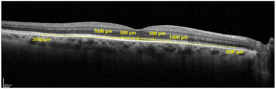 After quality assessment, OCTs were graded for image quality, vitreomacular adhesions (VMA), vitreomacular traction (VMT), epiretinal membrane (ERM), sub and intraretinal fluid and presence, and a count of the hyperreflective foci on the foveal scan. In addition, the outer layers (from the outer nuclear layer to Bruch’s Membrane) and inner layers (from outer plexiform layer to the internal limiting membrane) were measured at the fovea, 500 μm, 1000 μm, and 3000 μm nasal and temporal using the measurement tools in Heyex software (https://business-lounge.heidelbergengineering.com/us/en/) as shown in Figure 4. A choroidal measurement was taken at the fovea.