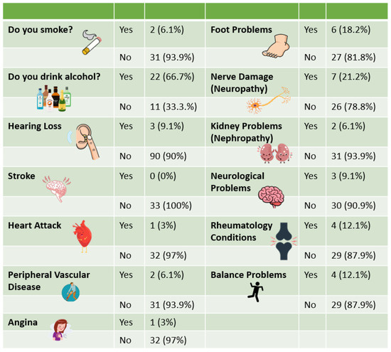 All declared co-morbidities were by people with diabetes except for one person with RP having foot problems. All those who currently or previously smoked had diabetes and three participants with diabetes had hearing loss. Medical history information for all participants can be found in Figure 5.