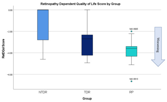 Results from the RetDQol (Figure 6) showed that there was a large range of scores from those with NTDR and most were around the 0.0 mark (no impact). Despite this, there were some with worse levels of retinopathy that showed some level of impact on their quality of life (Figure 7). People with TDR had a larger impact on quality of life with some levels mirroring people with RP. People with RP, as expected, showed worse levels of quality of life. Anomalies were participant NAVI005, who had very little vision loss, was young, and still able to drive, and NAVI013, who was less independent and was living with severe sight impairment. Analysis showed that quality of life was significantly more reduced in people with RP (p = 0.000) and TDR (p = 0.021) than those without NTDR.